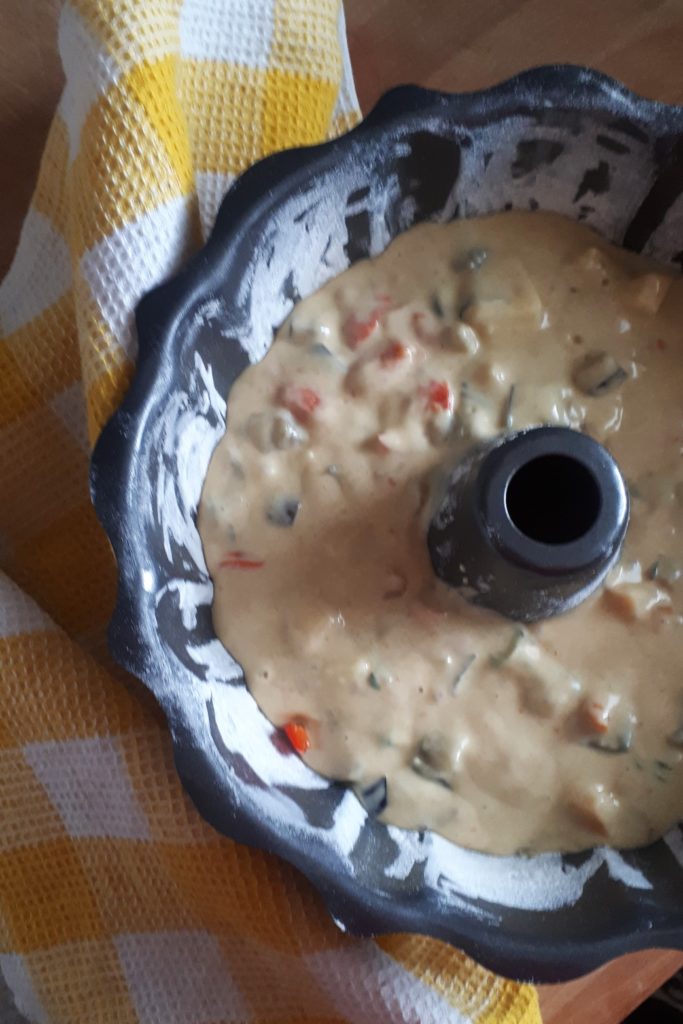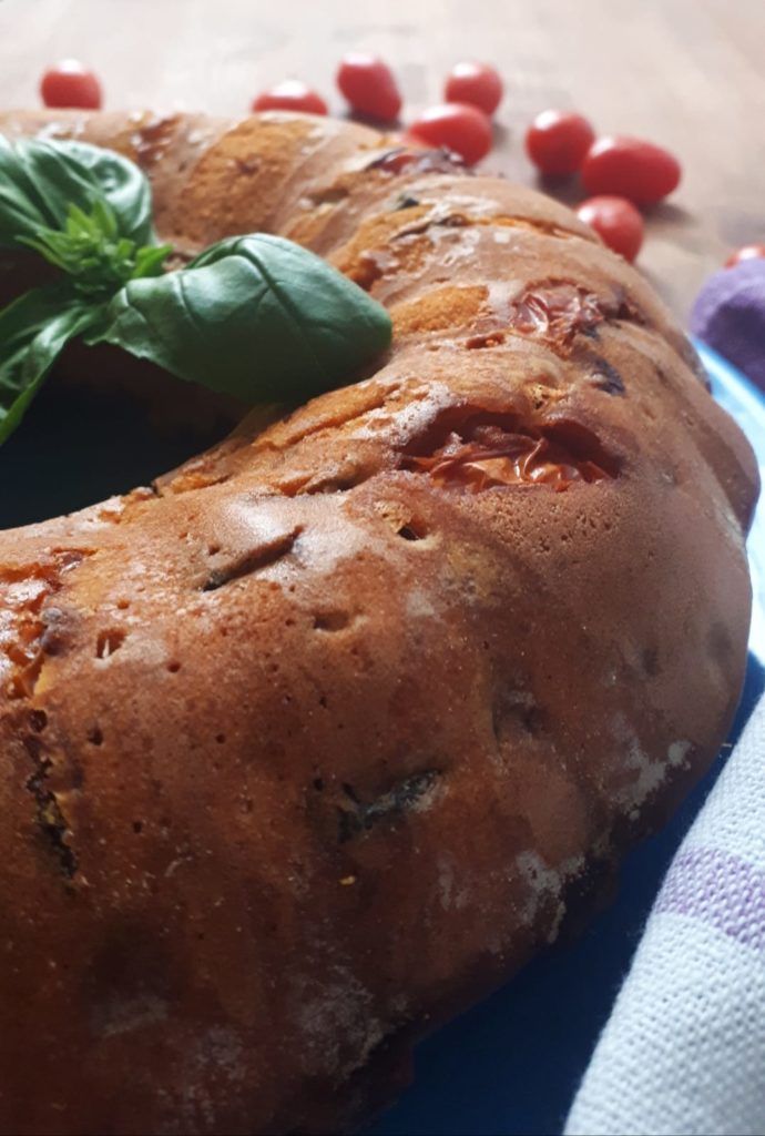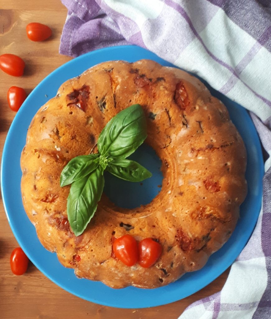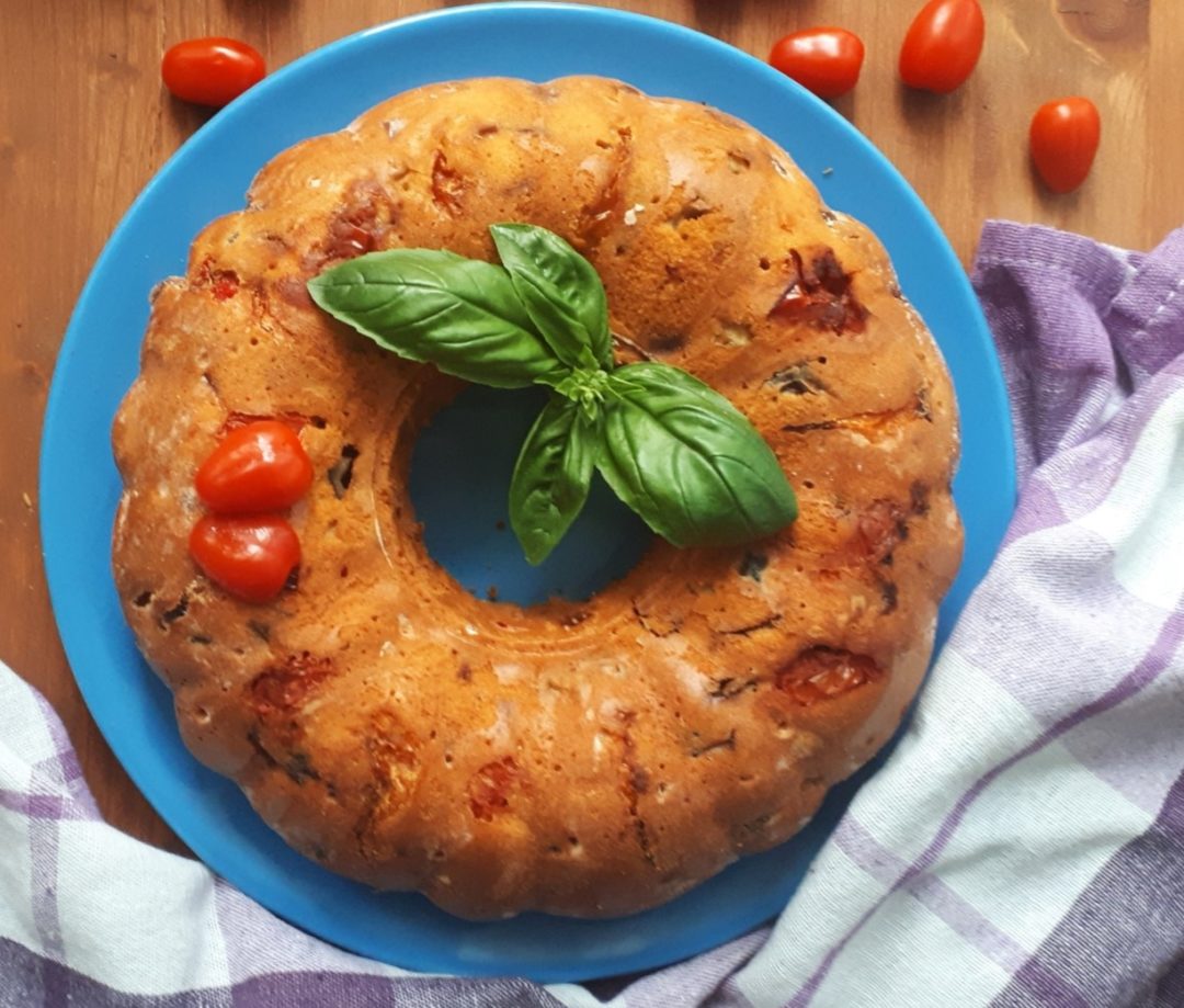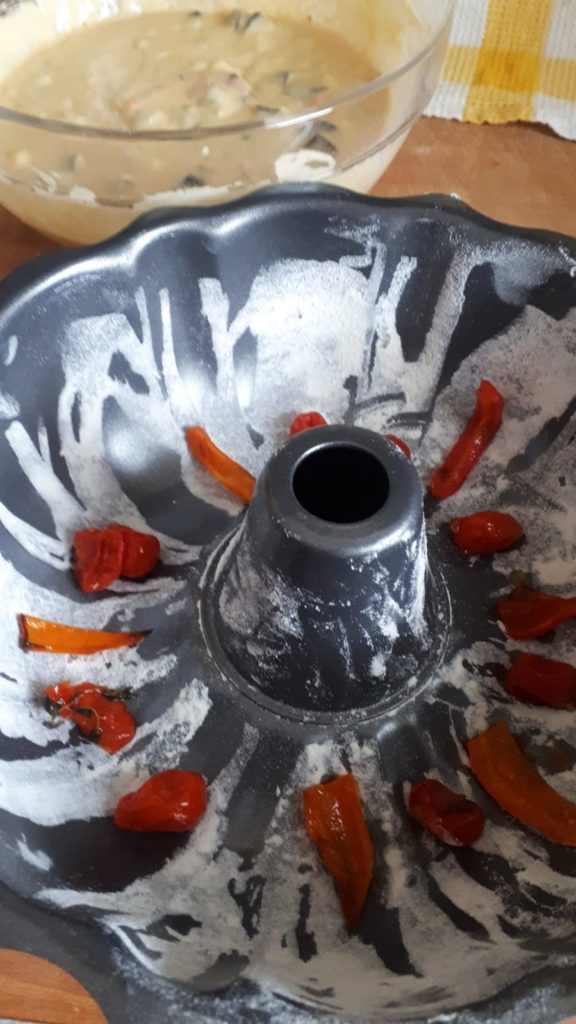 Imburriamo e infariniamo una forma da ciambella e mettiamo sul fondo i pomodorini tenuti da parte e poi versiamo il composto al suo interno.