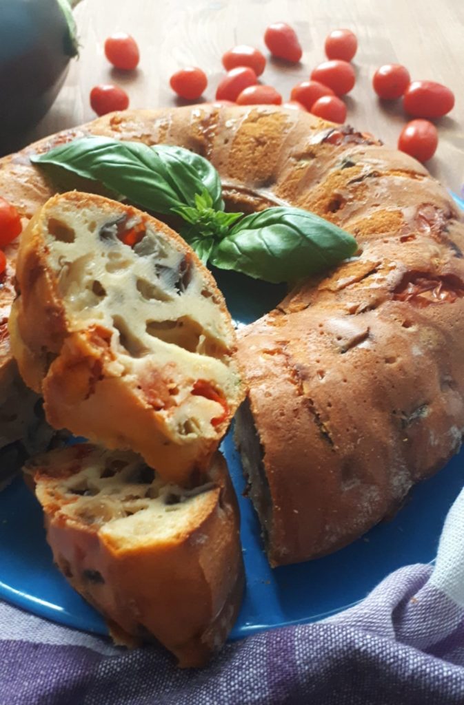 Ora in una ciotola grande sbattiamo le uova con l’olio di semi e il latte e quando otteniamo una crema spumosa aggiungiamo un cucchiaio alla volta la farina e il lievito. L’impasto deve essere senza grumi , io ho utilizzato una frusta per agevolare il lavoro. Aggiungiamo il sale, i pomodorini caramellati ( teniamone da parte solo 5 o sei per decorare) con il peperone e la melanzana cotta e la scamorza tagliata a dadini. Mescoliamo bene e per ultimo insaporiamo con le erbe rimaste (basilico e timo).