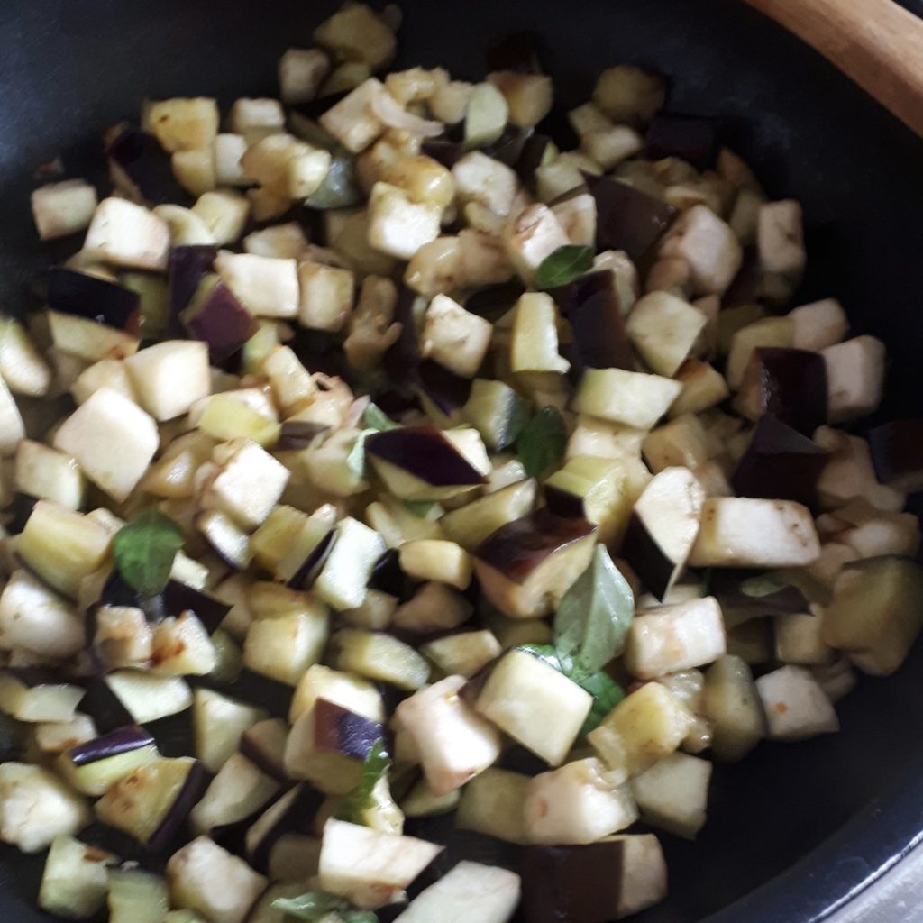 Prepariamo da prima la verdura tagliando la melanzana a cubetti e ripassandola in padella con olio e scalogno a fettine profumandole con qualche foglia di basilico (io ho utilizzato quello greco piccolo e profumatissimo, ma va bene quello normale a foglia grande). Facciamole appassire fino a che diventano morbide, ma non disfatte. A fine cottura trasferiamole in una ciotola a raffreddare.