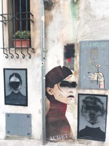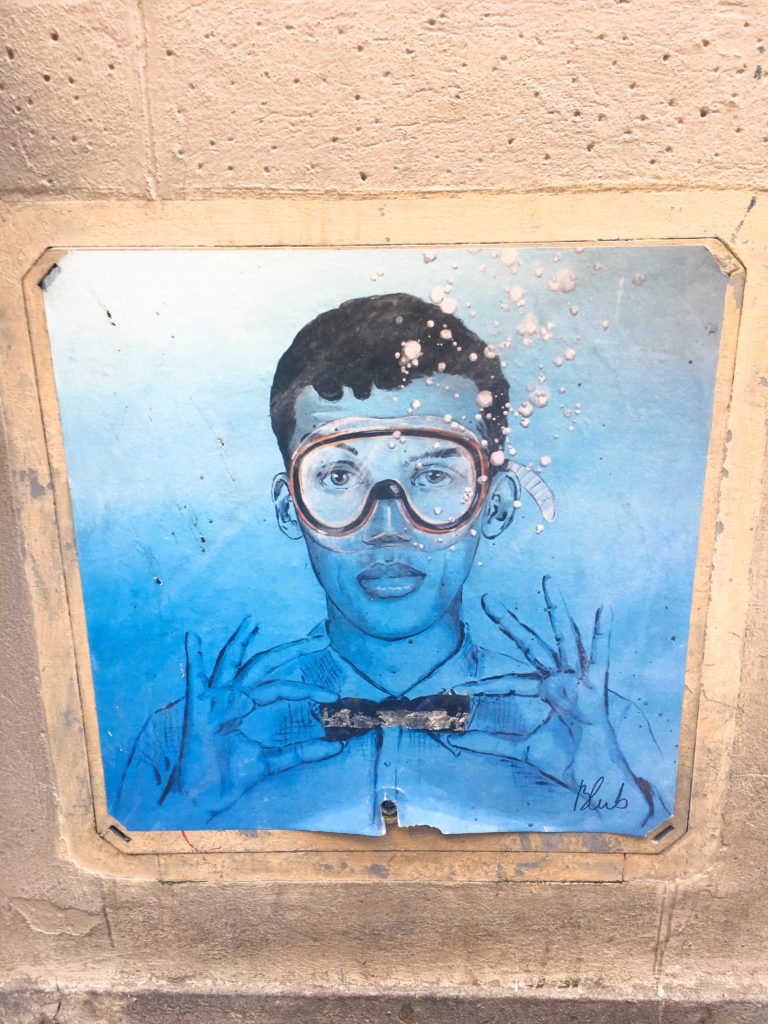 Partendo dal quartiere di San Niccolò incontriamo tante opere del writer fiorentino Blub, già diventato molto popolare nel mondo del web. Non sappiamo bene chi sia realmente se uomo o donna, quello invece che sappiamo è il suo motto, l’arte sa nuotare. In un’intervista alla Nazione dichiara: –“Metto le maschere da sub a Gesù e a Dante perché siamo con l’acqua alla gola”. Mette maschere anche a Leonardo da Vinci, alla Venere del Botticelli, a Pablo Picasso, a Lorenzo de’ Medici e tanti altri anche non famosi…per lo più sui toni del bianco e blu con qualche particolare rosso…Ed è così che uno sportello grigio del gas diventa una botta di colore, una faccia famosa o non famosa ma sempre con una maschera da sub!