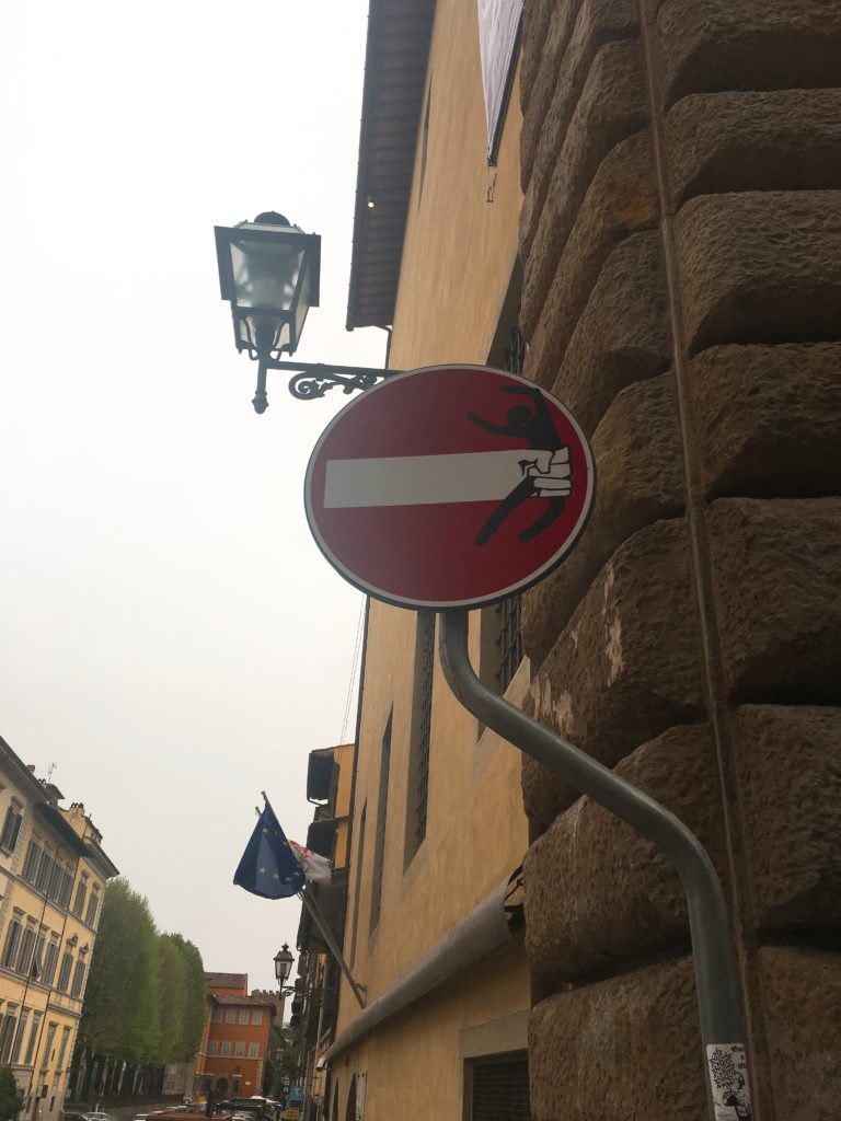 Sempre in zona San Niccolo’ è facile imbattersi anche nelle opere di Clet, artista che ritocca i segnali stradali.