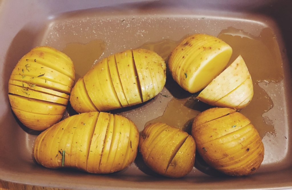 Vengono lasciate intere ma incise a fettine sottili in modo di avere una via di mezzo tra un classica patata al forno e delle chips croccanti.