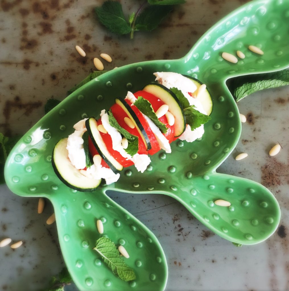 Lavate 8 pomodori grandi San Marzano e tagliateli a fettine nel senso della larghezza, senza però separarle dal fondo. Inserite nei tagli mozzarella di bufala senza lattosio, cetriolo o zucchina, foglie di menta o basilico. Condite con olio evo sale e pepe o peperoncino. Guarnite con pinoli tostati