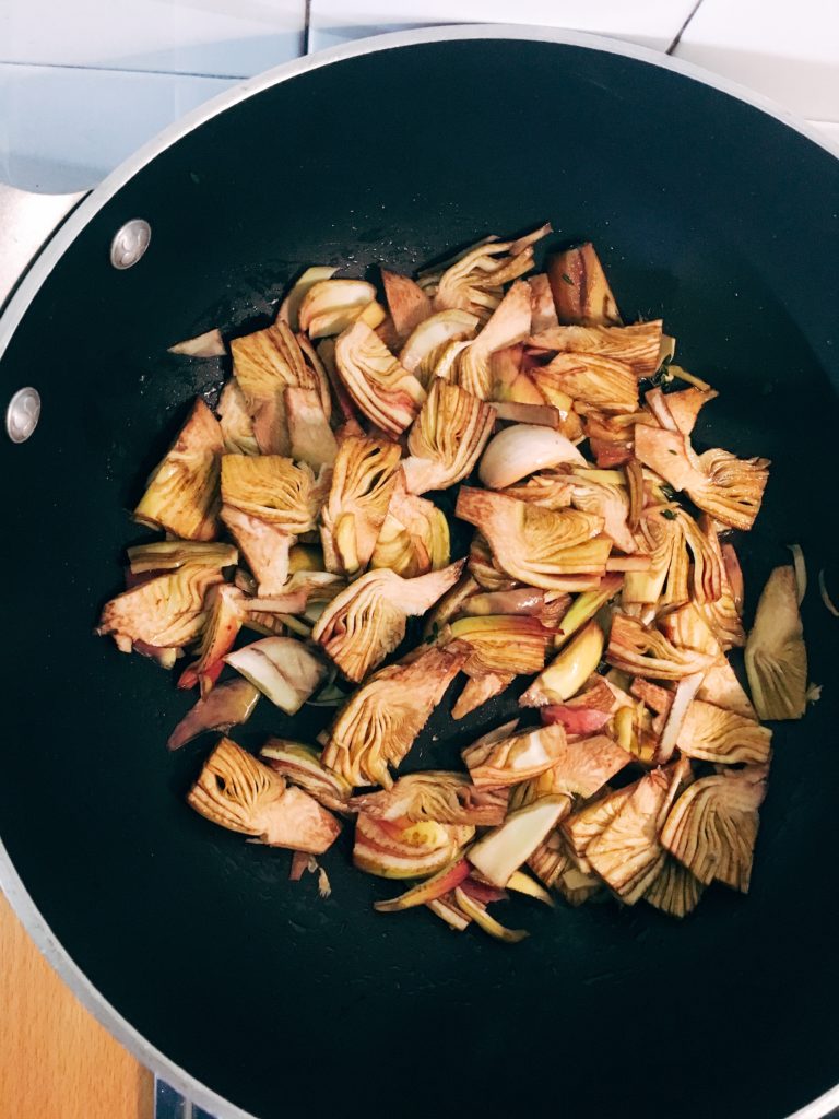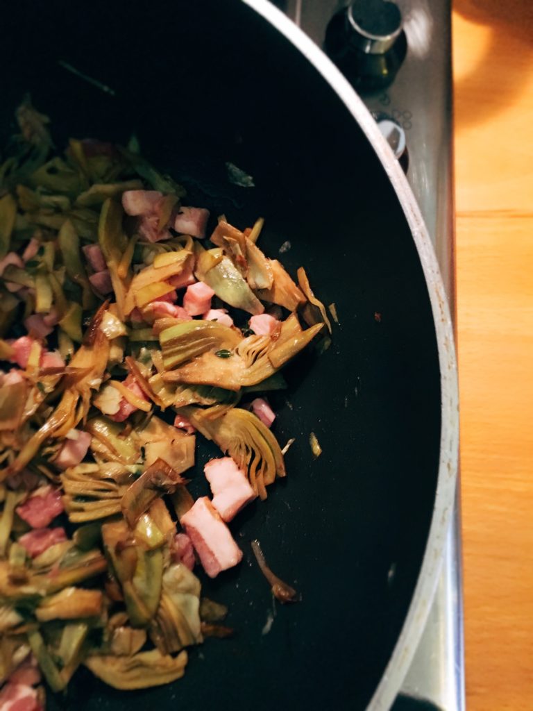 Pulite i carciofi e tagliateli a spicchi. Scaldate un cucchiaio di olio EVO in una pentola ampia, aggiungere l’aglio in camicia, il timo e la pancetta. Mettete i carciofi, sfumate con il vino bianco e coprire. Lasciate cuocere i carciofi per qualche minuto.