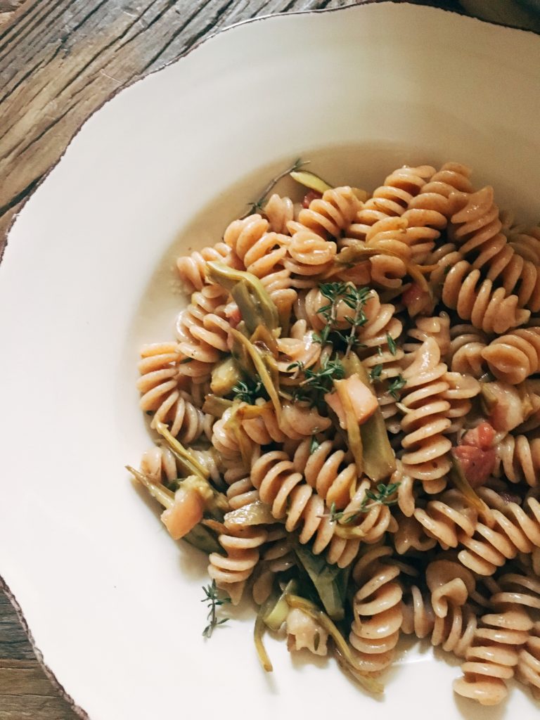 Sbattete adesso le uova con i formaggi, il pepe e il sale. Cuocete la pasta, scolatela e aggiungetela alla salsa. Aggiungete i carciofi e se serve un po’ di acqua di cottura della pasta. Finire con un trito di timo e servire ben caldo!