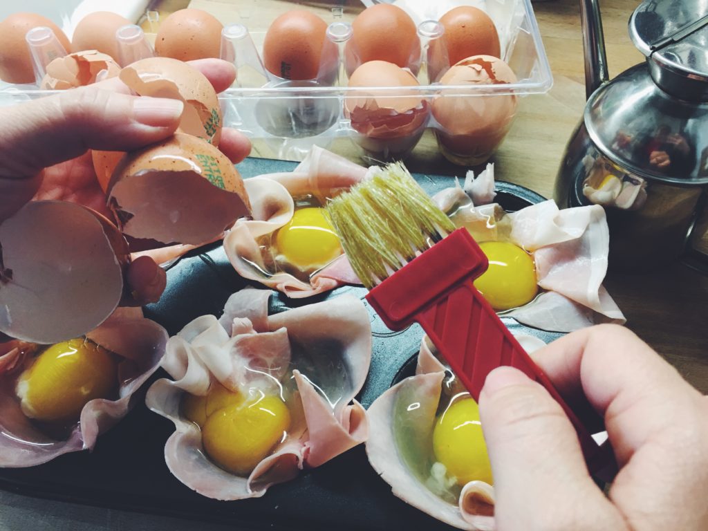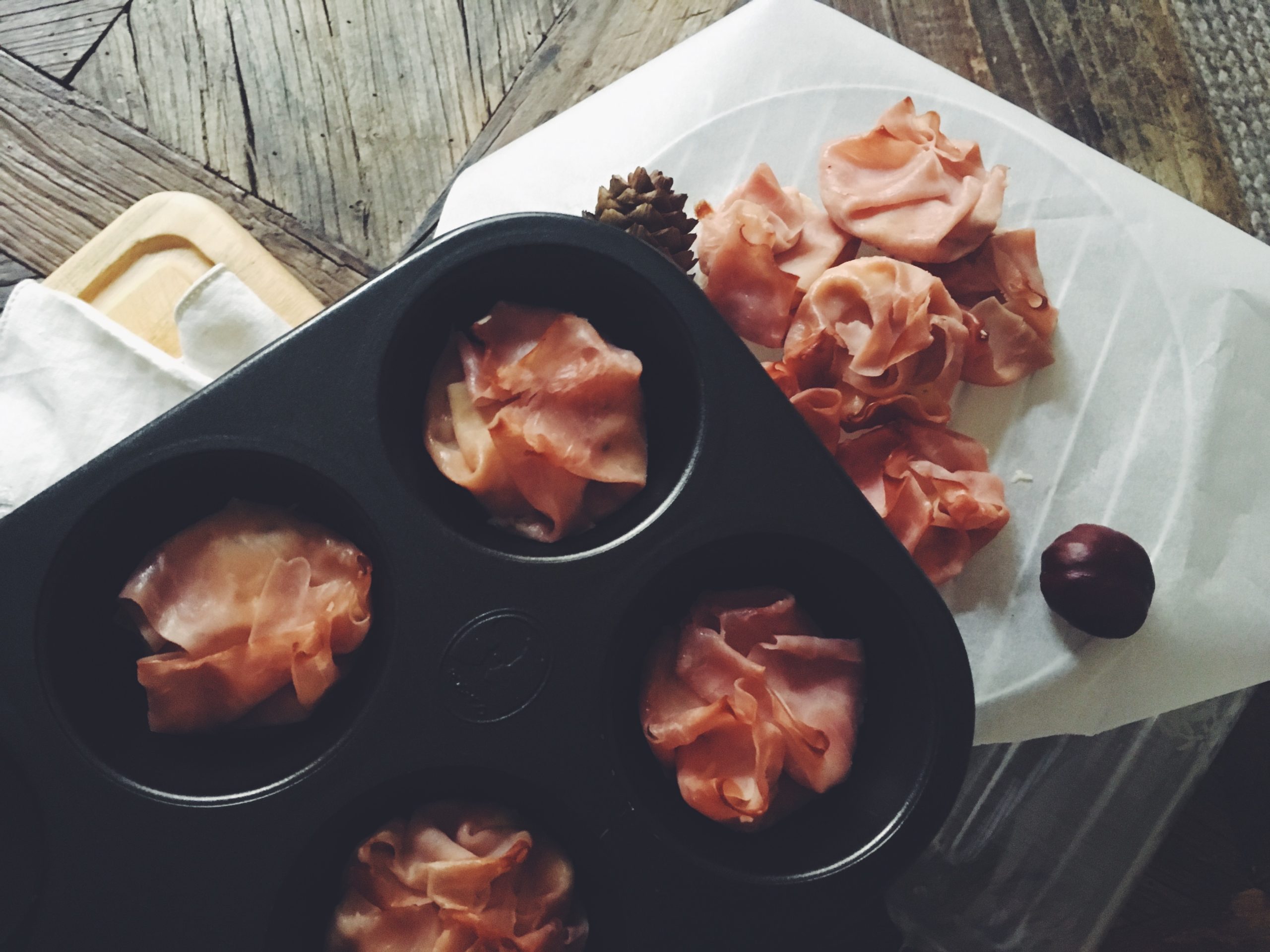 Il procedimento è semplicissimo…Ungete leggermente gli stampini con un pennello imbevuto di olio evo e rivestiteli con le fette di prosciutto cotto.