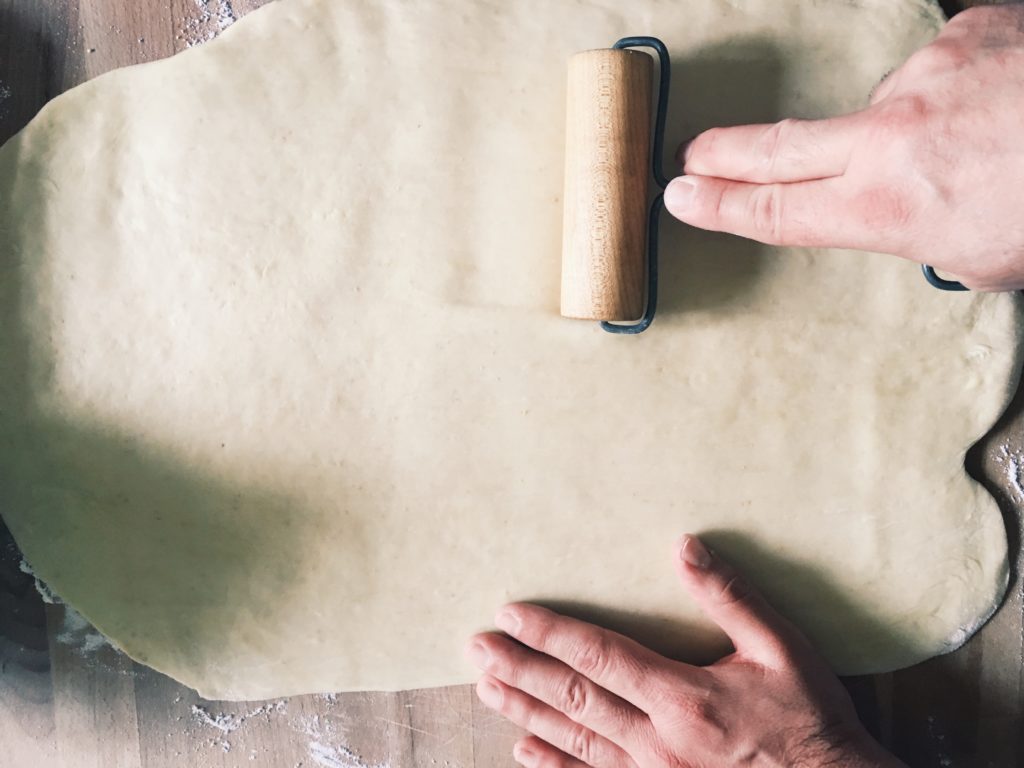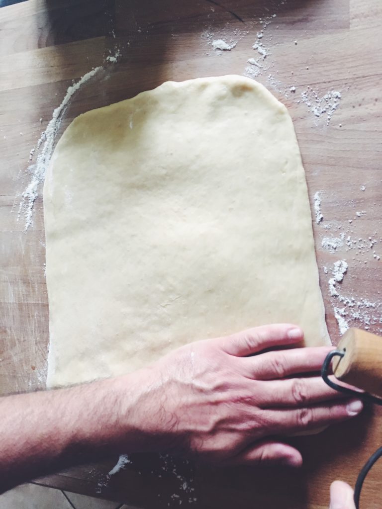 Riprendete l’impasto lievitato e sgonfiatelo su una spianatoia leggermente infarinata con l’aiuto di un matterello. Ottenete un rettangolo di 50 x 35 cm