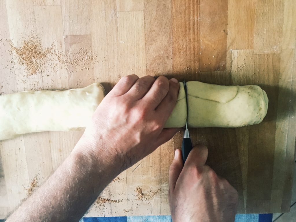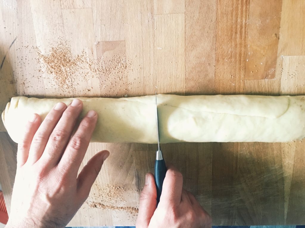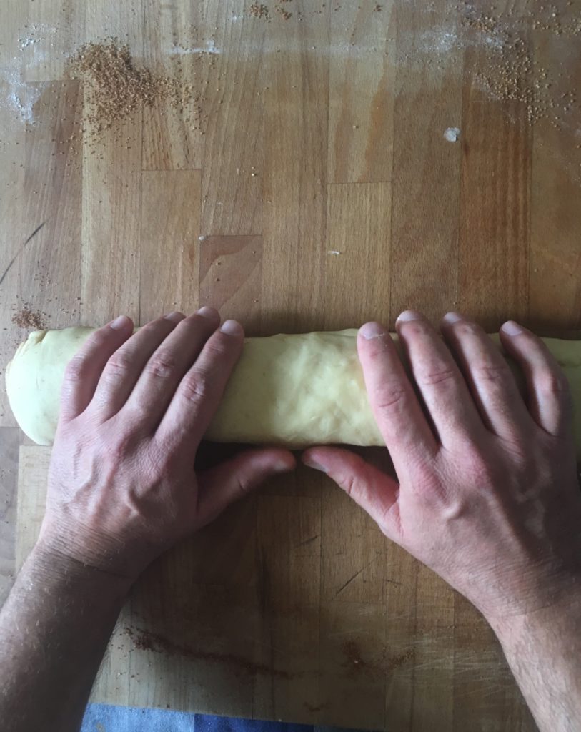 Arrivati a questo punto dovrete procedere ad arrotolare l’impasto. Cominciate sollevando delicatamente il lembo inferiore lungo tutto il lato più lungo, in questo modo vi aiuterete a staccarlo dalla spianatoia. Dopodiché procedete ad arrotolare un po’ alla volta e facendo attenzione ad arrotolare strettamente e senza schiacciare l’impasto. Ottenuto il rotolo dovrete modellarlo con le mani in modo da ottenere una lunghezza di 48 cm, perciò tenete ferma un’estremità con la mano e con l’altra fate delle leggere pressioni verso l’estremità che state bloccando, per dare una forma omogenea.