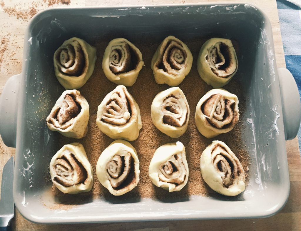 Ungete una teglia rettangolare e cospargetela con cannella e zucchero di canna. Sistemate i rotolini nella teglia tutti nello stesso verso distanziandoli tra loro 1 cm circa. Una volta disposti tutti i pezzi schiacciate delicatamente con le dita per rendere omogenea la forma di ogni rotolino. Lasciateli lievitare per altri 30 minuti almeno, quindi passate alla cottura. I cinnamon rolls cuociono in forno preriscaldato, in modalità statica, a 180° per circa 30 minuti. Una volta cotti lasciateli raffreddare completamente.