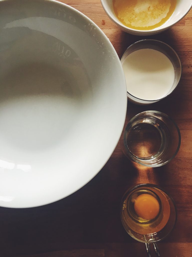 Fate lo stesso con gli ingredienti liquidi. In una ciotola versate l’acqua insieme al latte e l’uovo leggermente battuto