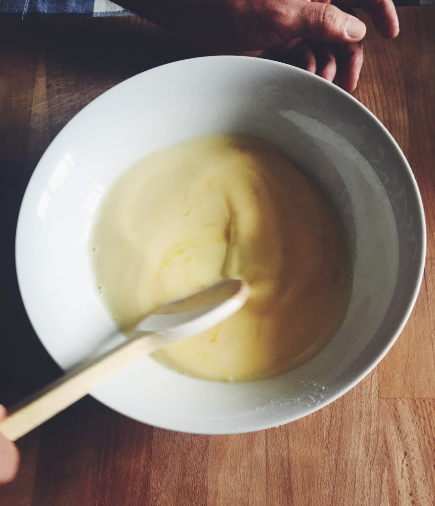 Cominciate facendo sciogliere il burro a fuoco basso e lasciandolo poi intiepidire una volta pronto.