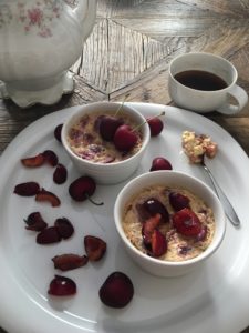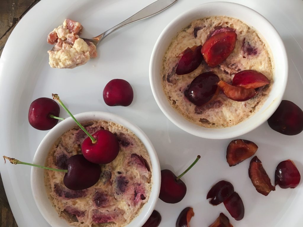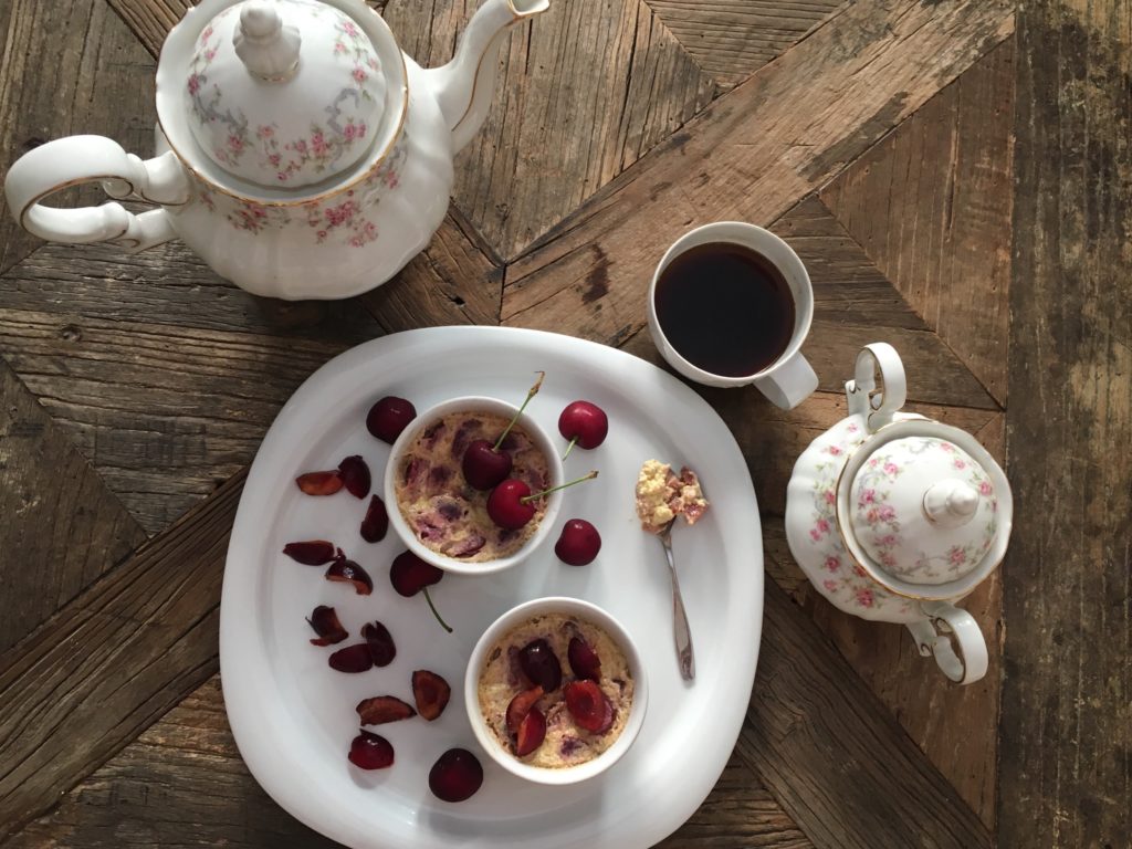 Lavate le ciliegie, togliete i piccioli ed eliminate i noccioli. Tagliatele a piccoli pezzi. Incidete il baccello di vaniglia e raschiate i semini; lavate bene il limone e prelevate la scorza con un pelapatate ad archetto. Versate in un pentolino la panna, il latte e aggiungete la scorza di limone e i semini di vaniglia. Portate a ebollizione spegnete e lasciate intiepidire. Disponete i tuorli in una ciotola, aggiungete lo zucchero e montate a lungo con le fruste elettriche in modo da ottenere una crema gonfia. Sempre agendo con la frusta, aggiungete a filo il latte e la panna tiepidi filtrati. Disponete i 3/4 delle ciliegie in 4 stampini resistenti al calore e coprite con la crema preparata; coprite adesso con un foglio di alluminio. Mettete gli stampini in una teglia da forno e versate acqua sufficiente ad arrivare ai 2/3 dell’altezza dei contenitori. Cuocete in forno già caldo a 180° per circa 1 ora.