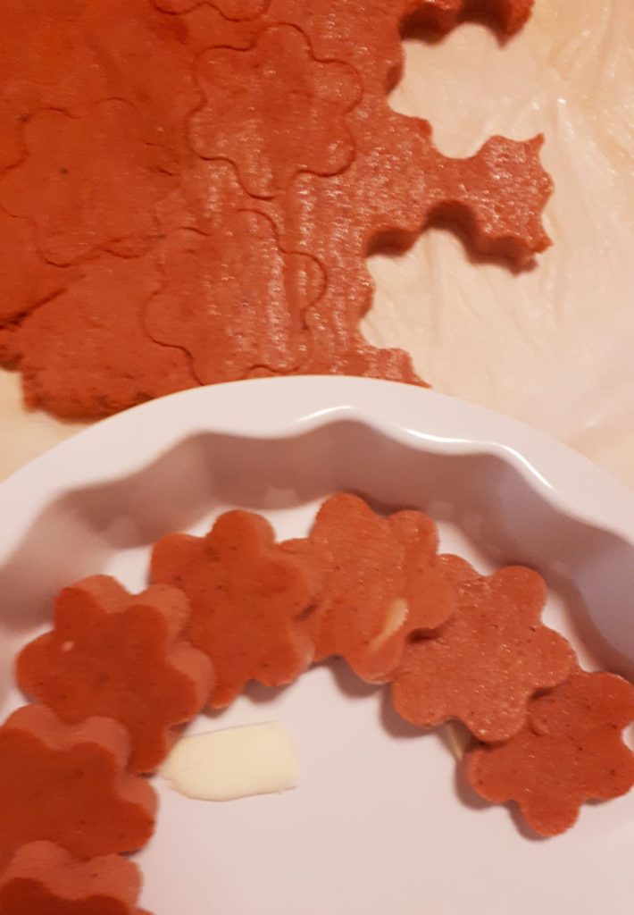 Con un bicchiere o una formina incidere i nostri gnocchi e posizionarli su una terrina o teglia da forno, decorare con dei fiocchetti di burro, una manciata di parmigiano grattugiato, le foglie di salvia e le nocciole tritate grossolanamente a pioggia sui nostri gnocchi.