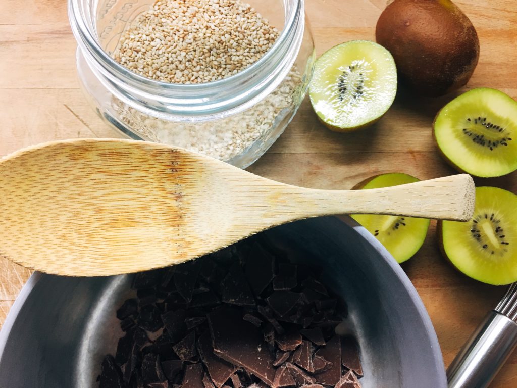 Sciogliete a bagnomaria il cioccolato e nel frattempo sbucciate e tagliate a fette non tanto basse i kiwi. Immergete metà fetta nel cioccolato, una alla volta, e appoggiate la fetta su una piccola teglia con carta forno. Prima che il cioccolato si solidifichi aggiungete i semi di sesamo. Procedete fino ad esaurimento del cioccolato o dei kiwi.