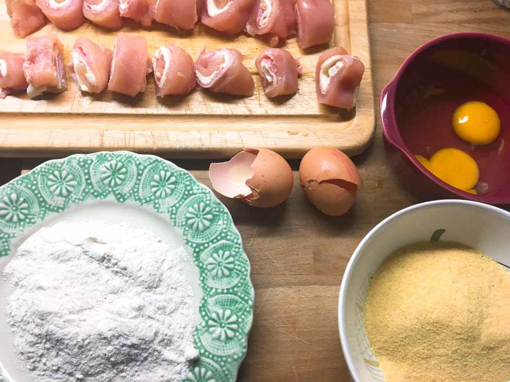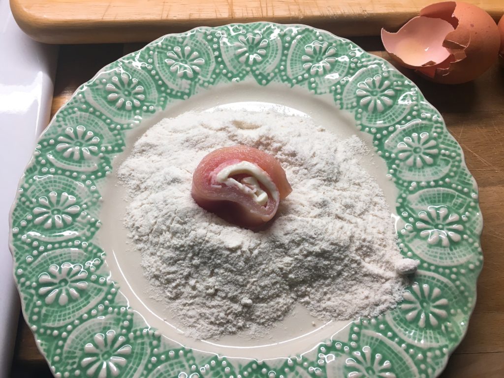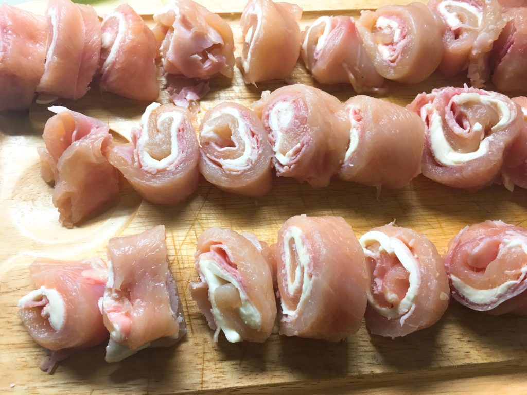 Prendete delle belle fette di petto di pollo non tanto alte e adagiatele una un foglio di carta forno. Copritele con un altro foglio di carta forno e schiacciatele bene con un mattarello. Disponetevi sopra una fetta di prosciutto cotto e due di provola dolce (potete utilizzare anche altri tipi di formaggio, sottilette, fontina…). Arrotolate la fetta di pollo con il ripieno su se stessa fino ad ottenere un involtino che andrete a tagliare a rondelle.