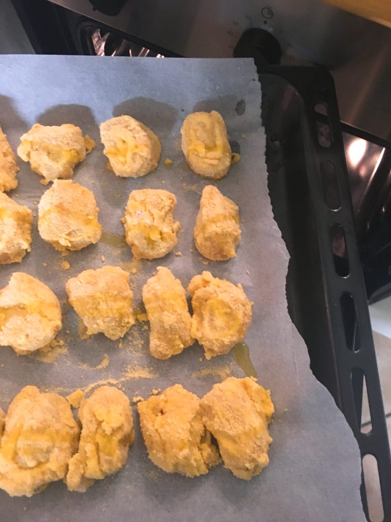 In forno già caldo a 180° per circa 20 minuti o fino a doratura dei nuggies, seguiteli controllando che non si brucino..