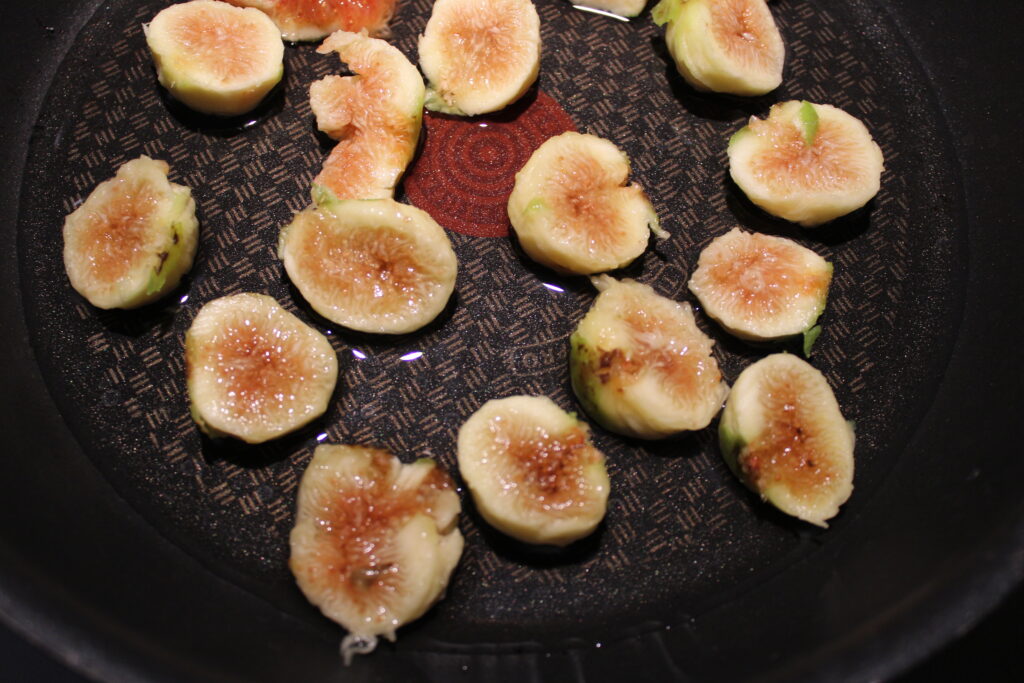 Sbucciamo i fichi e dividiamoli in 2 o 4 parti a seconda della grandezza e facciamoli cuocere a fuoco basso in una padella con un dito di acqua e i 4 cucchiai di zucchero. Lasciamo caramellare lentamente per una decina di minuti. Al termine lasciamo raffreddare nello sciroppo che si è formato.