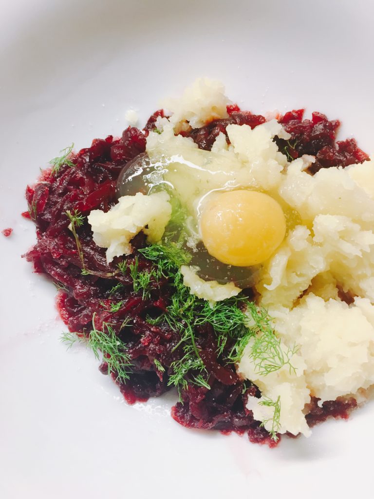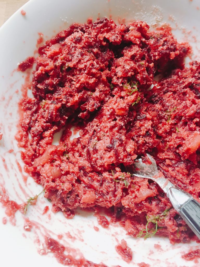 Grattugiate le barbabietole in una ciotola capiente, aggiungete la patata schiacciata precedentemente bollita, il parmigiano, il finocchietto, l’uovo e il pangrattato. Mescolate con cura e formate un composto che dovrà risultare omogeneo e non troppo molle. Aggiungete pangrattato se necessario…salate e pepate.