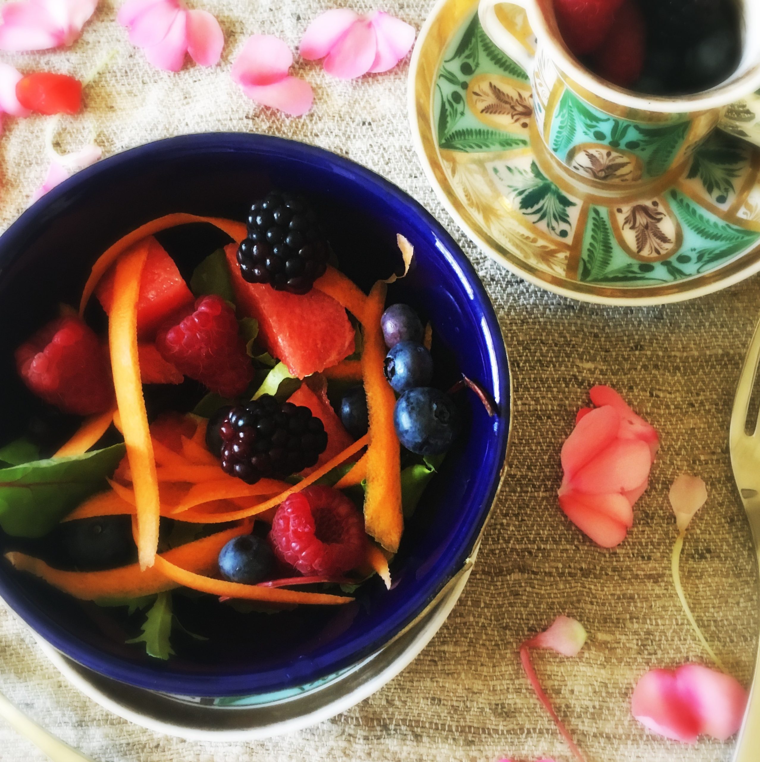 Questa insalata fresca e colorata viene cosi’ composta: PER 3 PERSONE: 1 avocado 1 cetriolo 1 finocchio 2 pomodori 1 pera 1 pesca gialla 1 pesca bianca 3 albicocche mature germogli di barbabietola germogli…