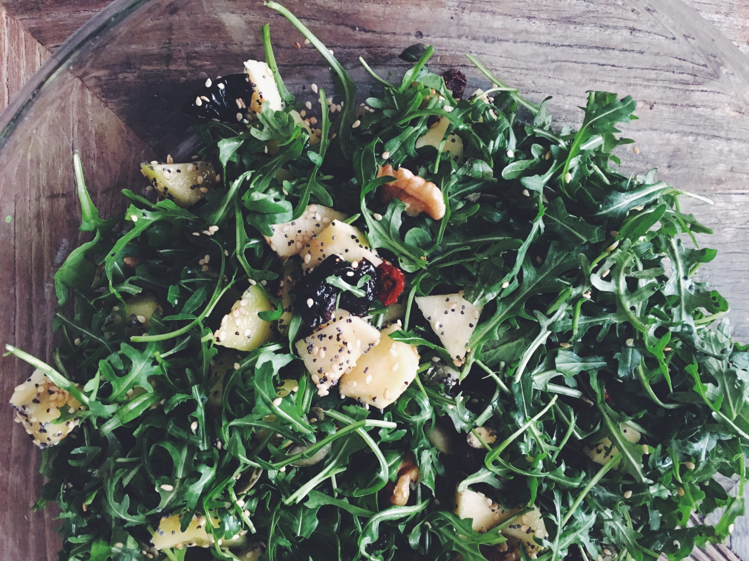 Un insalata che mixa più sapori, la verdura fresca e croccante (potete mettere verdura di ogni tipo) e il dolce della frutta…in più tanti semi che fanno bene e la rendono originale, gustosa e…