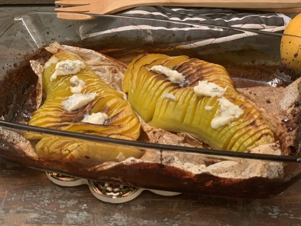 Le patate (o come la zucca in questo caso) Hasselback o Potato à la Hasselbacken sono un tipo di patata al forno, dove vengono tagliate a metà circa in sottili fette simili a ventaglio. Sono spesso servite con il piatto principale, ma possono anche essere adattati in contorni o tartine.