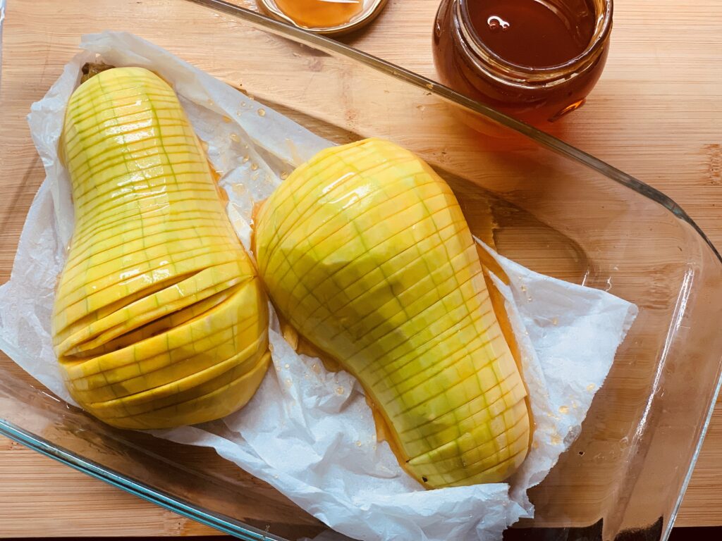 Accendete il forno a 180° modalità ventilata. Pelate la zucca con un pelapatate togliendo solo la pellicina in modo sottile. Tagliate la zucca a metà, privatela dei semi e disponetela su una teglia che avrete precedentemente coperto di carta da forno. Disponetela con la cavità rivolta verso il basso. Irrorate adesso di olio evo, sciroppo d’acero o spennellate con miele e spolverate di timo essiccato.