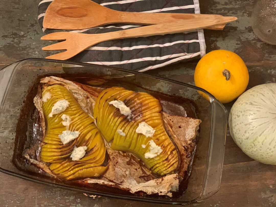 Le patate (o come la zucca in questo caso) Hasselback o Potato à la Hasselbacken sono un tipo di patata al forno, dove vengono tagliate a metà circa in sottili fette simili a ventaglio. Sono spesso servite con il piatto principale, ma possono anche essere adattati in contorni o tartine.